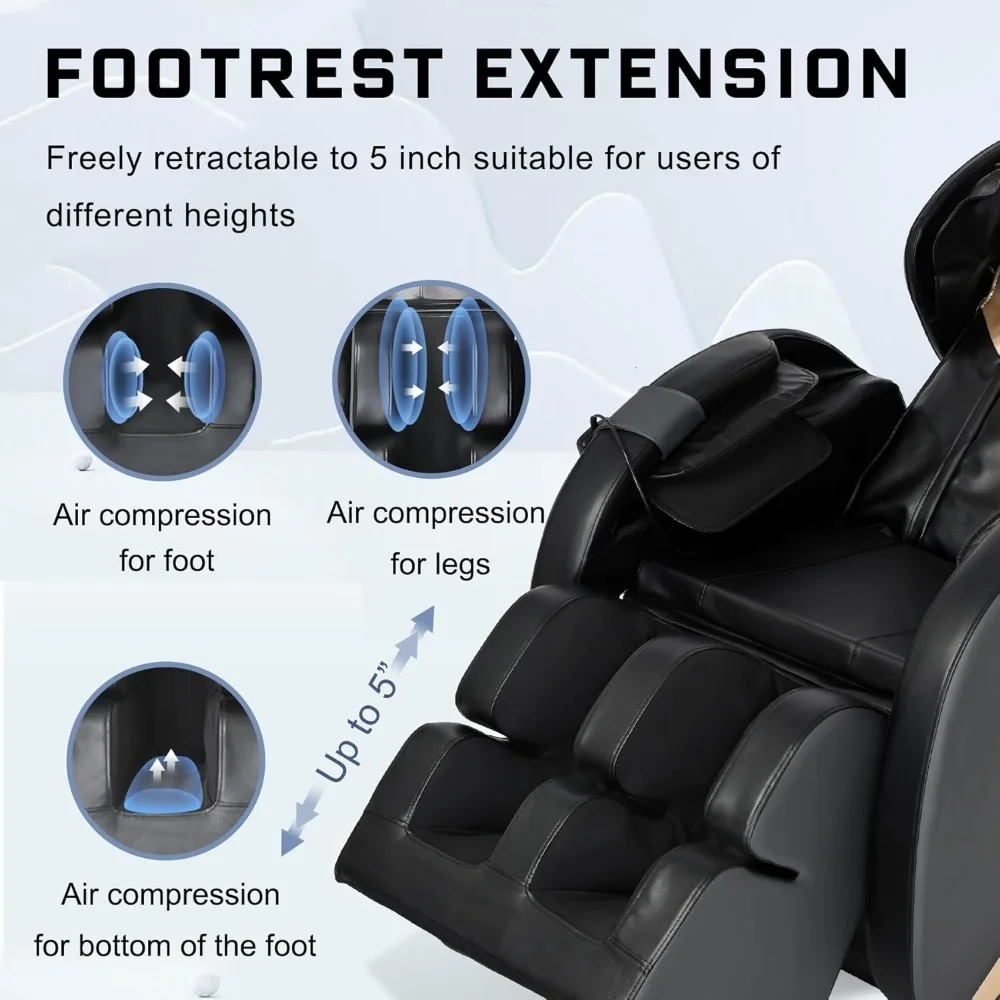 - Full Body Massage: Our massage chair offers 5 different automatic modes, providing you with personalized choices. There are multiple airbags on the shoulders, arms and calves to provide a whole body air compression massage experience. You can use the remote control to choose the appropriate massage mode and strength. Additionally, waist and leg have heating function, it can be heated in 3 minutes, promoting blood circulation, metabolism, and relieving muscle soreness.