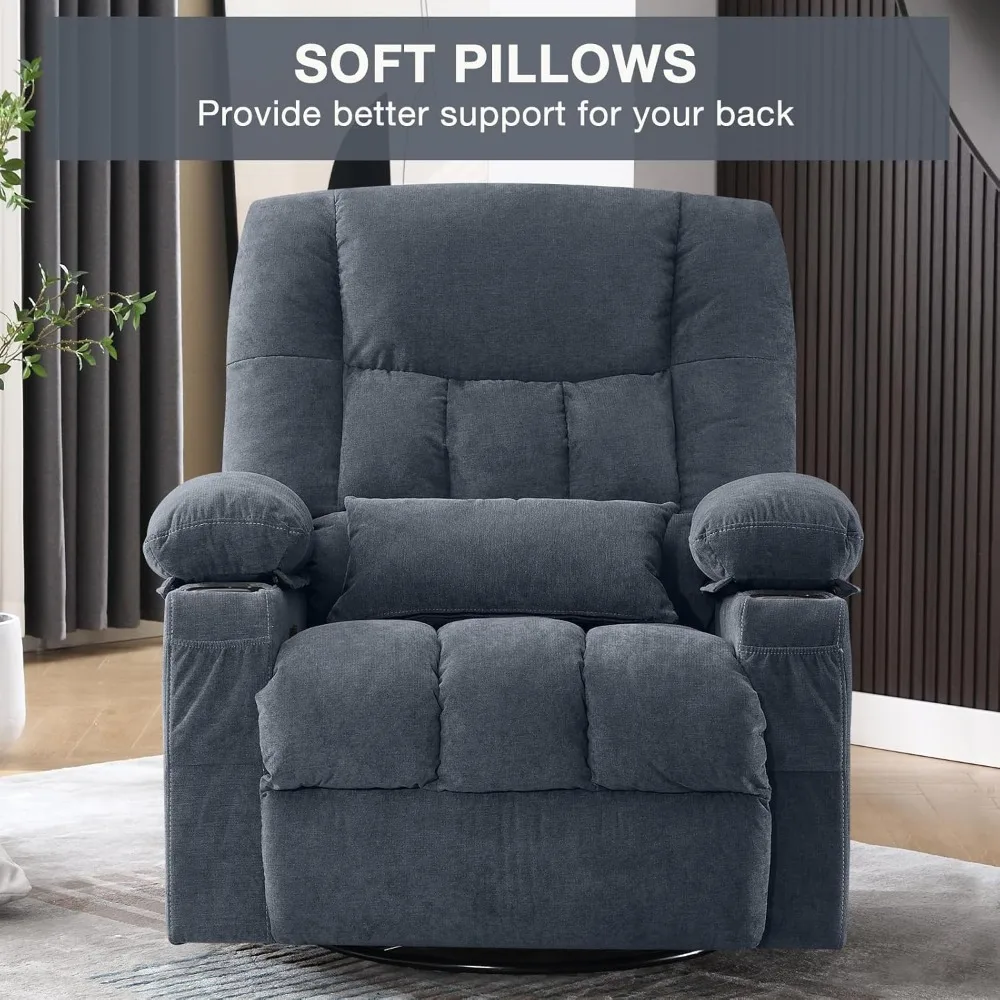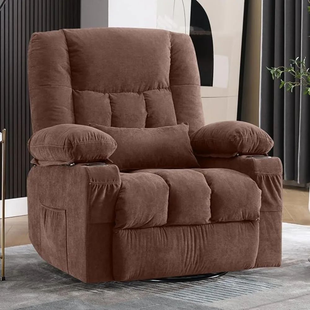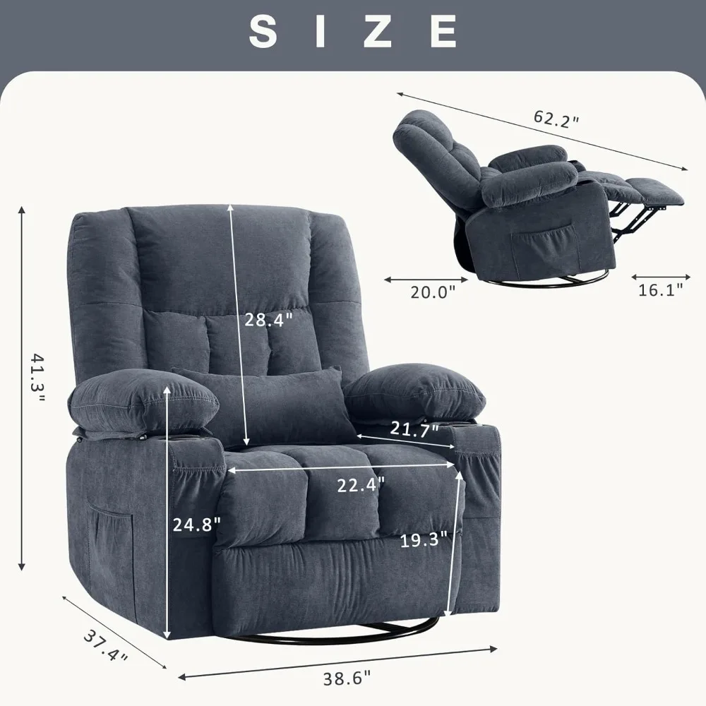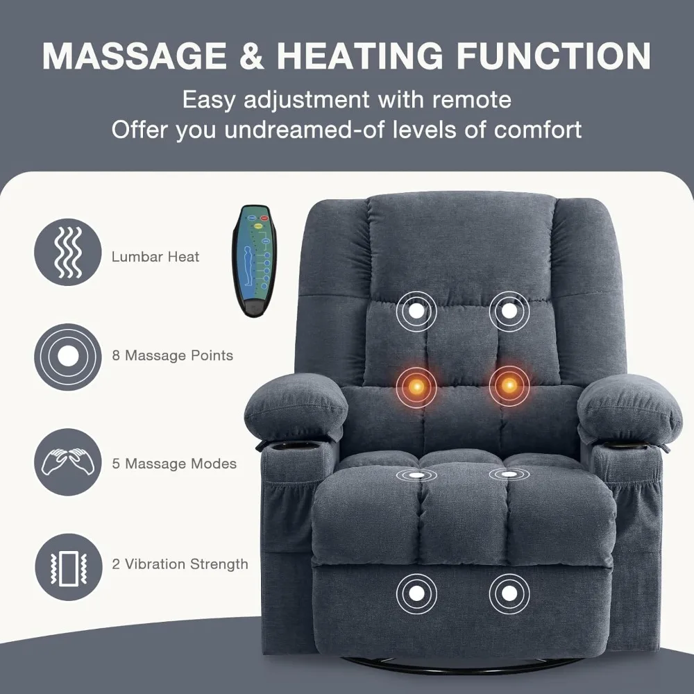 - γπ©πππ₯ππ§ππ’π‘ π ππ¦π¦πππ & ππππ§ππ‘πγ:This swivel rocker recliner with massage features 8 vibration massage points and 2 intensity options, catering to your unique needs. Targeting calves, thighs, waist, and shoulders, it allows for customized control of massage locations and intensities. Additionally, the waist area includes a heating feature to enhance blood circulation during your massage sessions.